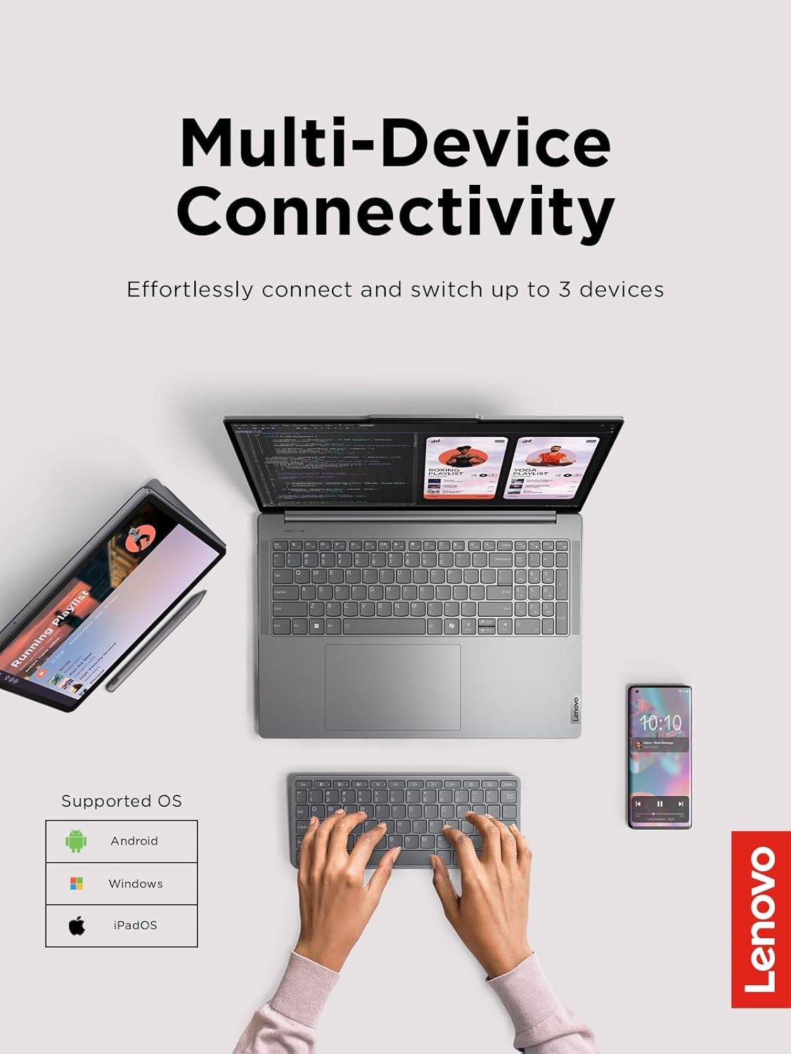 Atualize a sua experiência de escrita com o teclado Lenovo Multi-Device Wireless Tab. Conecte até 3 dispositivos e alterne entre eles sem esforço. Não importa se você está a usar Android, Windows ou iOS, você está apenas a um passo de aumentar a sua produtividade. Controle os seus dispositivos de uma forma nunca antes vista e alcance um novo nível de produtividade! E com uma autonomia para até 60 horas de utilização, não precisará de se preocupar em ficar sem bateria. Quando for hora de carregar a bateria, carregue rapidamente o Lenovo Multi-Device Wireless Tab com um cabo USB-C. Características Principais: Conecte até 3 dispositivos com alternância fácil via conectividade bluetooth; Compatível com dispositivos Android™, iPadOS e computadores Windows; Digitação conveniente, confortável e silenciosa graças às teclas de baixo perfil; Design elegante e formato compacto. Não passará indiferente aos olhares; Verdadeiramente compacto, permite fácil transporte numa mochila; Autonomia para até 60 horas, com bateria carregável via cabo USB-C; Teclado de incrível valor qualidade vs preço, para o profissional moderno. Especificações: Layout: PT-PT (Tecla Enter Grande) Teclas: 12 teclas de atalho e baixa distância de deslocação de 1.3 mm Conectividade: Bluetooth® ou USB-C Compatibilidade: Android™, Windows, iPadOS Autonomia: Até 60 horas Retroiluminação: Não Peso do produto: 180 g